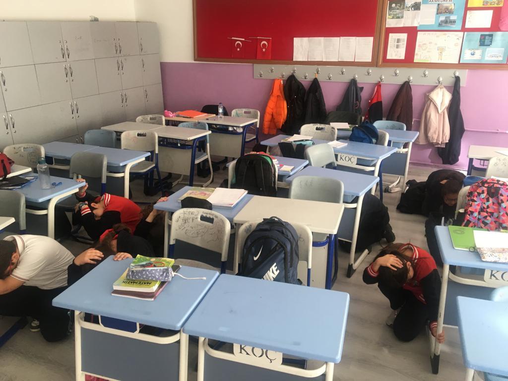 Okulumuzda İçişleri Bakanlığı genelgesi doğrultusunda 11.11. 2022 tarihinde Deprem Tatbikatı yapılmıştır. 4. ders saatinde bütün sınıflarda ve bütün derslerde, akıllı tahtalarda bulunan ÇÖK - KAPAN - TUTUN videosu izletilmiş, 5. Derste de alarmla birlikte ÇÖK - KAPAN - TUTUN hareketi yapılmıştır, tahliye yapılmamıştır. Ders öğretmenleri tarafından hem video izleme esnasında, hem de ÇÖK - KAPAN - TUTUN uygulaması esnasında fotoğraf çekimi yapılmıştır.