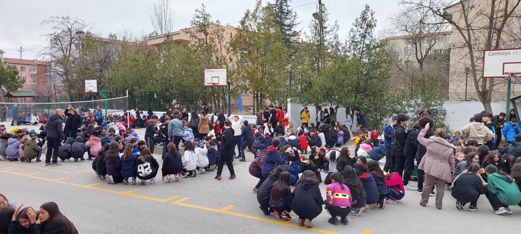 Afete Hazırlık Kulübünün rehberliğinde 1- 7 Mart Deprem Haftası etkinlikleri kapsamında 7 Mart 2024 tarihinde saat 10.10' da ilçemiz genelindeki tüm resmi ve özel okullarda eş zamanlı olarak gerçekleştirilmesi planlanan " Deprem Tahliye Tatbikatı" uygulaması tüm öğrenci ve öğretmenlerimizin katılımıyla başarılı bir şekilde gerçekleştirilmiştir.
