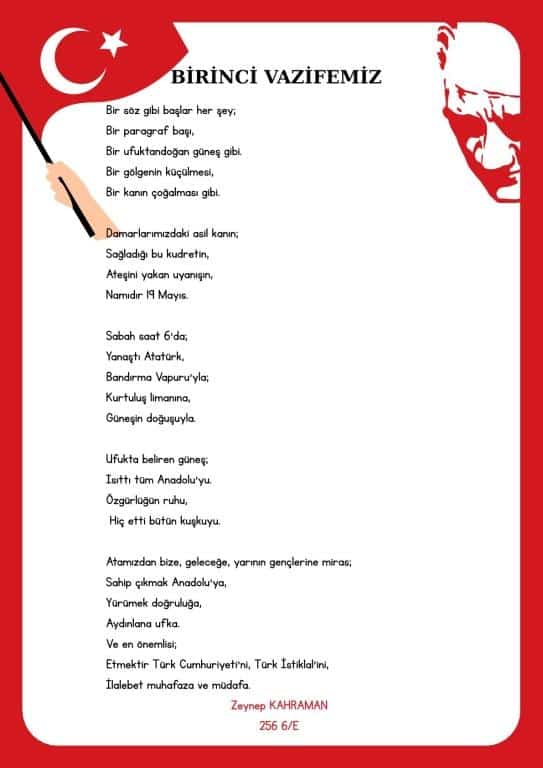 Dilimizin Zenginlikleri kapsamında Nisan ayında sınıflarımızda "Bu nedir?" etkinliği ve duvar yazısı çalışmaları yapıldı. Dilimizin Zenginlikleri Projesi Nisan ayı etkinliği olarak okulumuzda 23 Nisan Ulusal Egemenlik ve Çocuk Bayramı konulu şiir yarışması yapıldı. Yarışmada birinci olan öğrencimiz Elif Simay ATÇEKEN "Hürriyet Meşaleleri" isimli şiiri Dilimizin Zenginlikleri kapsamında düzenlenen şiir yarışmasına gönderildi. Ayrıca 23 Nisan Ulusal Egemenlik ve Çocuk Bayramı kutlama töreninde de okundu ve büyük beğeni topladı. Öğrencimizi tebrik eder, başarılarının devamını dileriz.